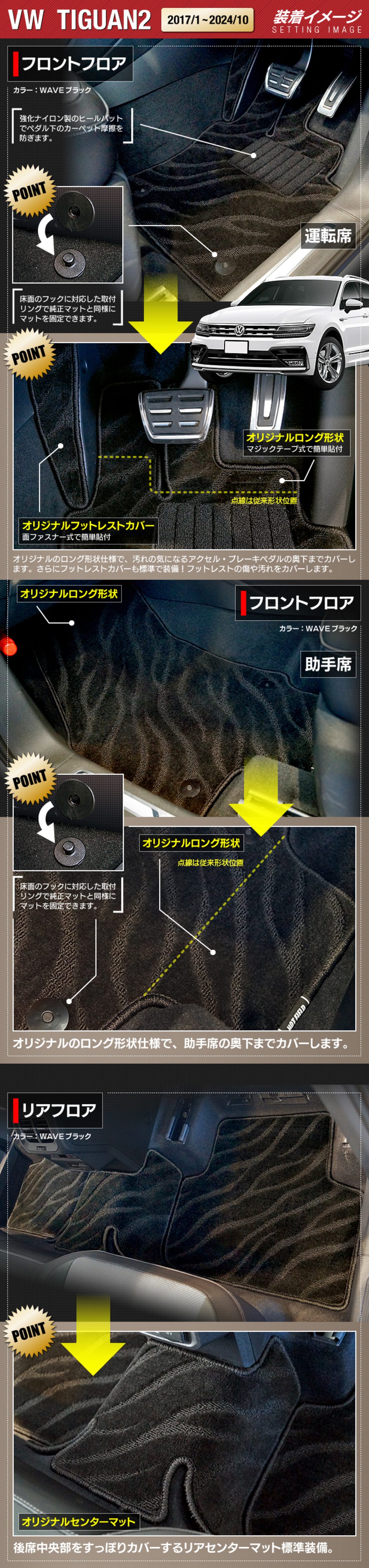 2023年式ティグアンRライン4モーション用に購入しました。価格以上のマットで大満足です。特に、リアセンター用のマットが秀逸で、マット先端にプラスチック部品が付いており、その部分をコンソールに挟み込み固定することができ大感動です。ビックマイナー後の車にもピッタリです。お勧め致します。