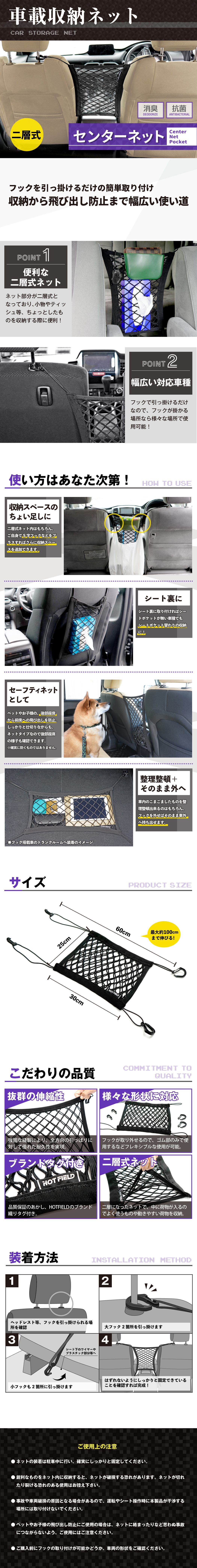 車を購入する前にYoutuberの方が紹介されていて、同じような商品を探していたところ、HOTFIELDさんでも取扱があり購入させていただきました。ハリアーはものを置いておくスペースが少なく、このセンターネットは非常に重宝しています。ネットとネットの間に挟むと物が固定され、すぐに取り出せます。買って良かった商品です。ありがとうございました。
