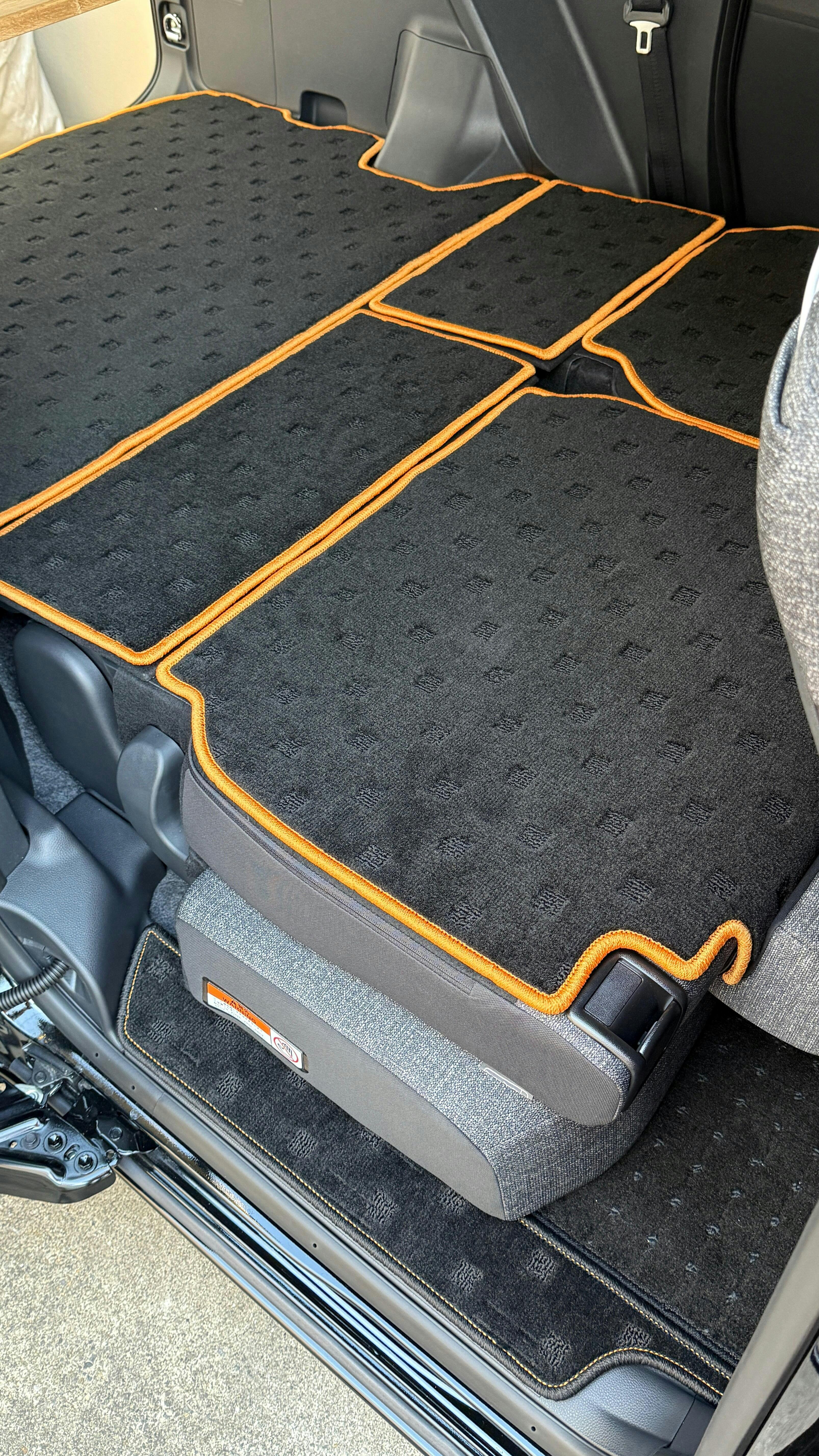 荷室にがんがん荷物を積んで運用するスタイルを想定していたので、汚れが気にならないようにベースとオーバーロックは黒、ステッチはベージュとしました。オプションのバンパーガードも追加しています。