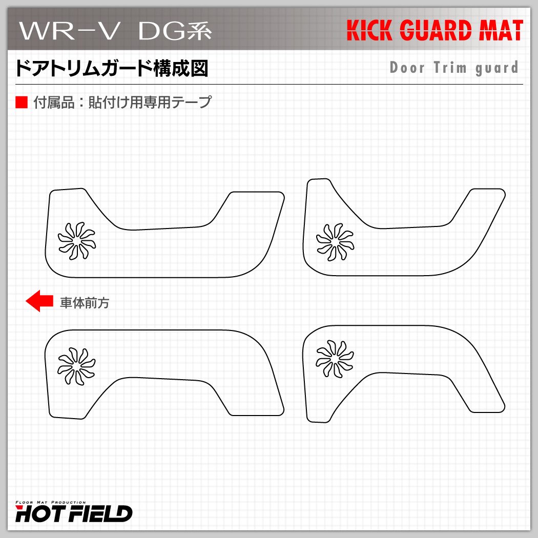 説明書の商品構成図に室内側の製品形状を元に運転席側/助手席側/後席右側/後席左側の図面が記載されています。その図面上に(製品表側)にそのままHITテープの取り付け位置を記入されてしまったことにより、実際に張り付ける製品の裏面側の位置と逆になってしまっています。改正品の車体前方方向に対する構成図の名称を気にしなければ裏面に取り付けること自体は可能です。ただし、説明書通りの配置名称で設置することは不可能です。「運転席側と助手席側」、「後席右側と後席左側」がそれぞれ逆側にして取り付けることが必要です。