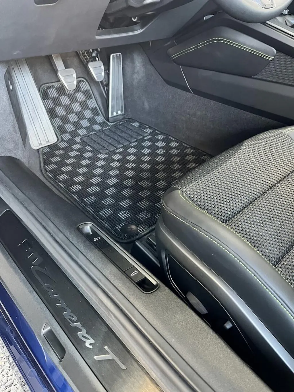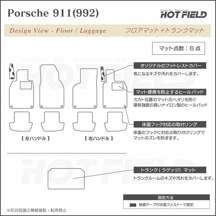 911なので、後席は人が乗るようなことはないが 前席、後席さらにフロントトランクまでのマットがセットで、しかもベースカラーの選択だけでなく、縁取りの色まで選択可能で、価格との相対的なパフォーマンスは抜群です。PCCBのイエローと合わせてイエローステッチでなかなかいい感じです。ポルシェツーリング仲間からも大絶賛でした。