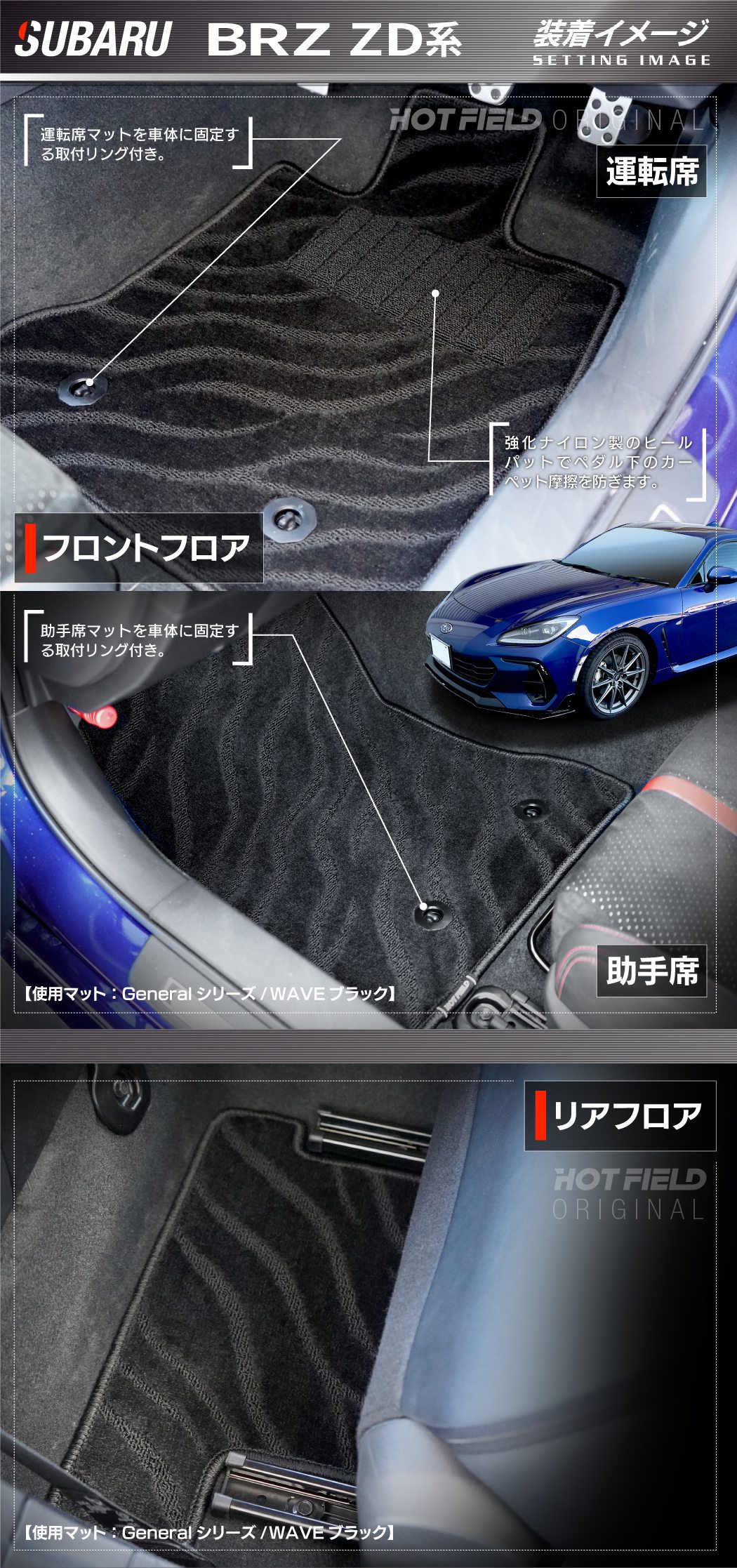 新型BRZを納車してしばらくは純正のマットを使用していましたが、何か物足りなさを感じていた所、こちらの商品を発見・即購入! WAVE調の模様はわりと落ち着いていて、サイズと共に車内の雰囲気にピッタリ!足元の演出効果大♪