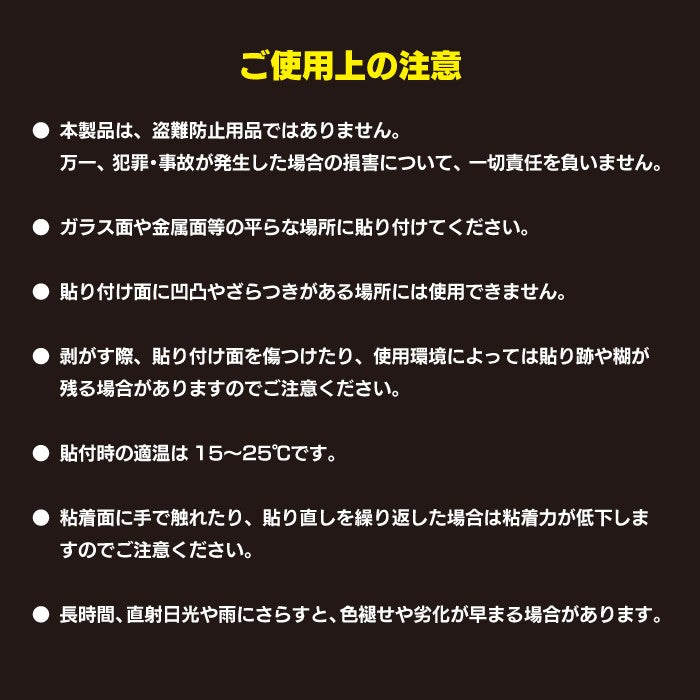 商品説明自動車盗難、いたずら、嫌がらせの強力な抑止力となる警告ステッカー。